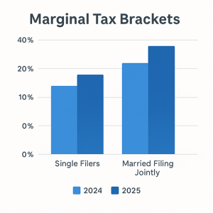 One of the biggest changes in 2025 is the increase in the standard deduction. KPMG’s planning guide notes that for the 2024 tax year the standard deduction was $14,600 for single filers, $21,900 for heads of household, and $29,200 for married couples filing jointly. Fidelity reports that in 2025 these amounts rise to $15,000 for single filers and $30,000 for married couples filing jointly. Because the standard deduction eliminates tax on the first slice of income, many taxpayers will find that itemizing deductions is no longer worthwhile.